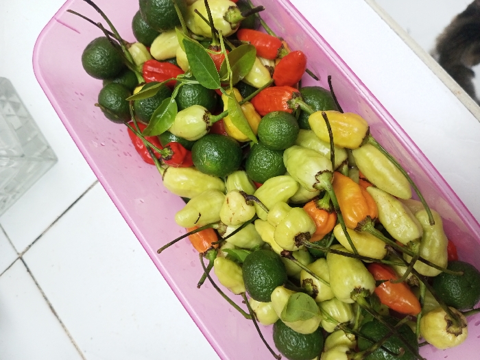 A pink container overflows with a mix of vibrant produce. Small, round green limes mingle with a variety of peppers, ranging in color from pale yellow and light green to orange and bright red. The peppers vary in shape, some round and squat, others elongated and pointed. Green stems protrude from the tops of the fruit. A portion of a white tiled surface is visible, along with a partial view of a cat.