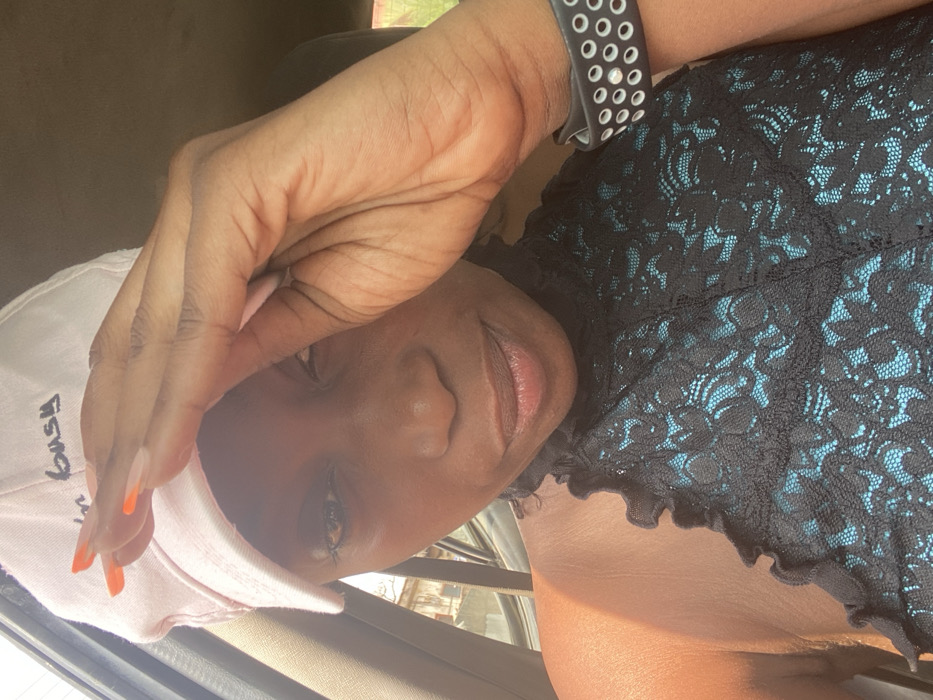 A close-up, chest-up portrait shows an adult individual, likely female, with dark skin, positioned inside a vehicle