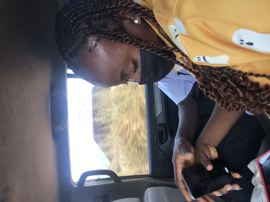 The scene depicts the interior of a moving vehicle in Ogbunike, Nigeria, from a passenger's perspective. In the foreground, a dark-skinned female individual with long brown twist braids wears a black face mask covering her mouth and nose. She is dressed in a yellow long-sleeved shirt patterned with white ghost figures. Her visible left ear features a single silver stud earring. Both hands, with light blue-painted fingernails on the left, hold a dark-colored smartphone, with her gaze directed downwards towards its screen. A second electronic device, partially visible with a red case, rests near her lap on the bottom left. Behind her, a second individual is partially visible, wearing a white short-sleeved top with a yellow collar or stripe, suggesting they are positioned further back or in the driver's seat. The vehicle's interior has a light-colored ceiling and a dark gray door panel with a handle. Outside the window, the landscape is blurred, indicating the vehicle is in motion. Visible through the window are areas of dry, light brown vegetation or ground, and in the distance, a building with a red-orange roof, under a bright sky.