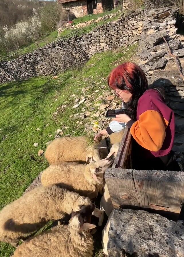 A young woman with red hair is feeding a flock of sheep from a wooden trough outdoors on a sunny day. She is using her phone to take a picture or video of the sheep as they eat. The sheep are a light beige color and are crowding around the trough. Two small goats, one black and one gray, are also present, attempting to eat. The setting appears to be a rural, hilly area with a stone wall in the background. A traditional-looking house with a red tile roof is also visible in the distance. The woman is wearing glasses and a maroon sweatshirt with orange sleeves. The ground is covered with green grass and some stones.