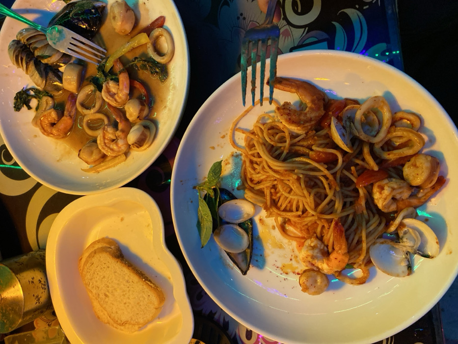 The image presents an overhead view of a dining scene, observed in Pattaya City, Thailand, featuring three dishes on a patterned table. In the upper left, a white, kidney-shaped serving dish contains two slices of lightly toasted bread. In the upper right, a white round plate holds a partially consumed seafood dish. This plate contains multiple shelled shrimp, squid rings, various shellfish (including scallops and dark-shelled mussels/clams), and green leafy vegetables immersed in a light brown sauce. A lime-green plastic fork is partially visible, resting in the food. The lower portion of the image shows a larger white round plate, also containing a partially consumed meal. This dish features spaghetti tossed in a reddish sauce with numerous seafood components, including shelled shrimp, squid rings, and white clams. One open mussel or clam shell, with its white contents exposed, is garnished with several green basil leaves. A silver-toned metal fork is positioned above the right side of this plate, with its tines oriented towards the food. The table surface beneath the dishes exhibits an abstract, repeating pattern composed of swirls and organic shapes in black, purple, blue, and yellow-green tones. The scene is illuminated by artificial light, casting visible yellow, blue, and green reflections on the white plates and food, suggesting an indoor or evening setting. A metallic, cylindrical object is partially visible in the far upper left background.