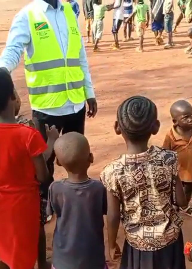 A man wearing a light blue shirt and a bright green safety vest with the letters "TPC" on it is standing in a dirt field, interacting with a group of young children. The children, mostly dressed in colorful, casual clothing, are gathered around him, looking up and listening. In the background, there are more children playing and walking around the field. The scene seems to be taking place in a rural area, with simple structures visible in the distance and trees surrounding the open space. The lighting indicates it is daytime, possibly mid-morning or early afternoon. The focus of the video is on the interaction between the man and the group of children.