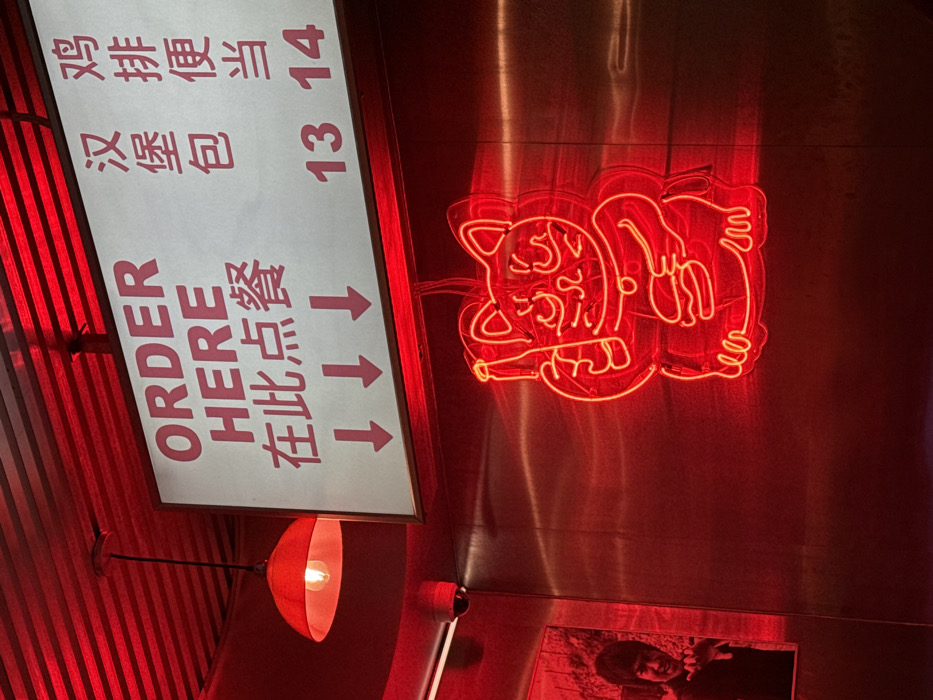 A brightly lit, red-toned restaurant interior features an illuminated sign that reads "ORDER HERE" in English and Chinese, directing customers downwards with arrows. Next to the sign, a neon red cartoon cat light fixture adds a playful touch. A red lamp with a single bulb hangs nearby, casting a warm glow on the scene. A glimpse of a black and white photo appears on the lower right.
