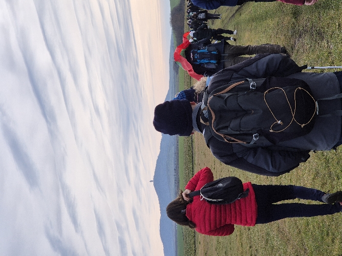 A group of individuals is observed walking along a grassy path in the vicinity of the city of Stara Reka, Bulgaria. The sky features extensive, linear altocumulus cloud formations. The immediate foreground features the back of an individual wearing a dark-colored padded jacket, a dark beanie, and a black hiking backpack equipped with light-colored elastic cord lacing. A single walking stick is visible extending downwards near their right side. To the left and slightly behind, a second individual, also observed from the rear, is dressed in a red puffer jacket and dark trousers, carrying a small black backpack by its strap over their left shoulder. A procession of additional individuals continues into the midground, all oriented in the same direction of travel. One subject within this group displays a blue backpack and a red textile object partially covering their head and upper back. The ground consists of a discernible path composed of packed earth and sparse grass, bordered by wider grassy fields. In the far distance, a prominent, green-tinged hill rises, topped by a tall, slender, cylindrical structure, characteristic of a communications tower.