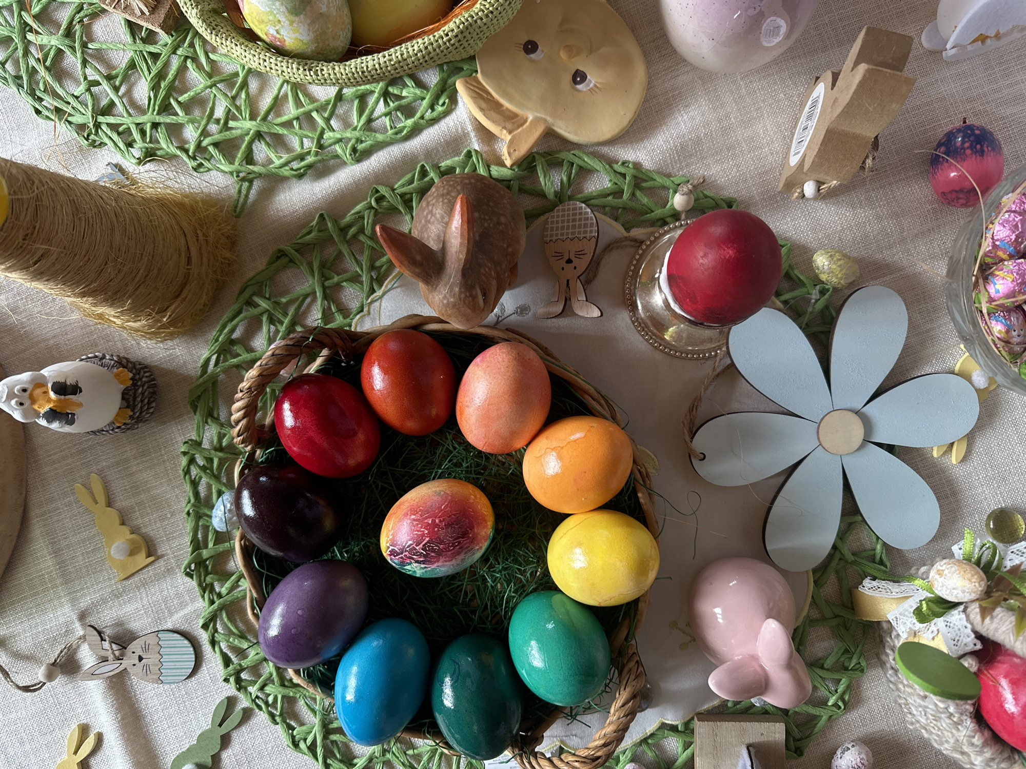 n Easter-themed tabletop arrangement. A basket filled with colorful dyed Easter eggs sits in the center, surrounded by green raffia. Around the basket are various Easter decorations including ceramic bunnies, wooden cutouts of bunnies and a flower, and other decorative eggs and baskets. The scene is lit by natural light, suggesting an indoor setting. There is no indication that the photo was taken in Dobrich, Bulgaria.