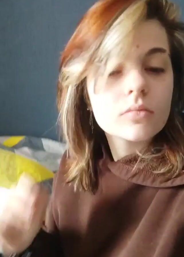 - "A young woman with fair skin and light brown hair with blonde highlights sits on a bed, wearing a brown sweatshirt and black pants" by FM-HHgqC2, licensed under CC BY 4.0