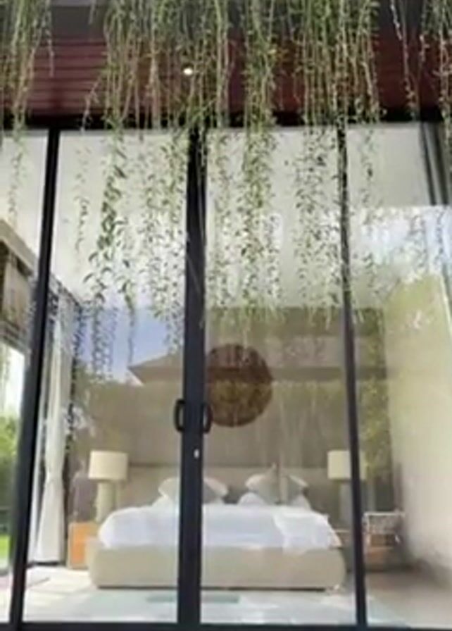 view of a bedroom through a glass sliding door. Green vines hang above the door. The bedroom has a bed with white linens, nightstands with lamps, and a woven basket. Outside, there's a tree propped up with wooden supports. Beyond the tree, there's a swimming pool with a view of a lush green rice paddy field dotted with palm trees under a partly cloudy sky.