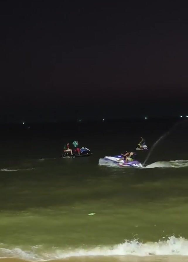 At night, three jet skis move across the water, which is breaking into foamy waves at the sandy beach