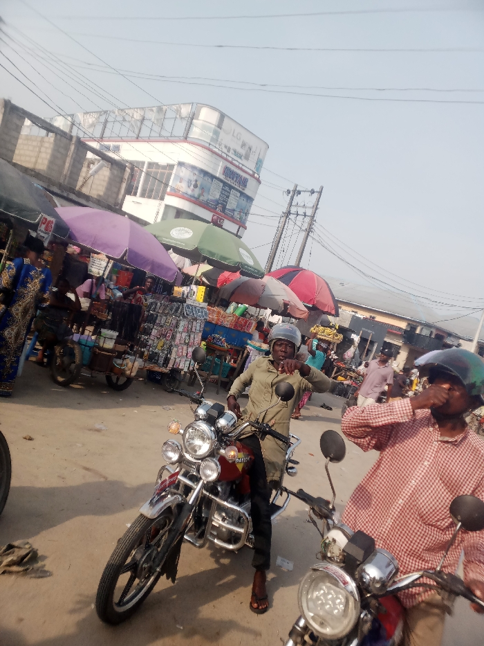 The image depicts a bustling outdoor market scene in Ughelli, Nigeria, under bright daylight. In the immediate foreground, two men are positioned on motorcycles. On the left, a man wearing a light olive-green long-sleeved shirt, dark pants, and black sandals is seated astride a red "DANFO" brand motorcycle with chrome accents and twin headlights. He wears a grey helmet and his right arm is raised with a clenched fist, pointing towards the background. To his right, partially obscured by the first motorcycle, another man wearing a red and white checkered long-sleeved shirt and a dark green helmet is seated on a darker motorcycle. His right hand is raised to his face, near his eye. The background is filled with various market stalls, characterized by large, colorful umbrellas providing shade, including purple, green, and red ones. Merchandise, prominently featuring phone accessories like cases and chargers, is displayed on tables and stands beneath these umbrellas. Several individuals are visible amidst the stalls, engaging in market activity. On the far left, a person in a blue and gold patterned garment is partially visible. Further back, a multi-story building stands, featuring "LG" and "GWINNER" signage on its upper levels. Overhead, a network of power lines and utility poles is visible against a clear, light sky. The ground appears to be unpaved earth.
