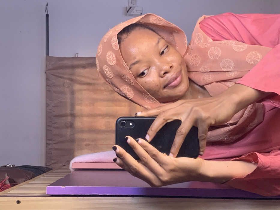 An indoor scene depicts a young Black female taking a selfie in what appears to be a mirror