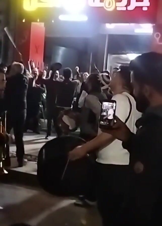 A group of people are celebrating or protesting in front of a store with Arabic writing and a flame logo on its sign. The event seems lively, with people raising their hands in the air and cheering. Several individuals are playing drums, contributing to the festive atmosphere. One person is recording the event with their smartphone, capturing the energy of the moment. The crowd is densely packed, making it difficult to discern individual features beyond general descriptions like clothing color and hair. The scene is illuminated by the store's bright lights and appears to be taking place at night.
