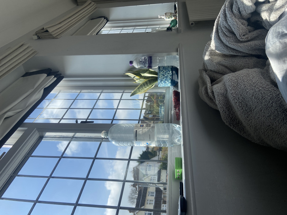 The image depicts an interior perspective looking through a white-framed window with grid-patterned panes, offering a view of a residential area within the city of Welwyn Hatfield, United Kingdom. The exterior scene features suburban houses, consistent with British architecture, alongside visible trees under a bright blue sky with sparse white clouds. Cream-colored Roman blinds with dark contrasting edges are partially raised at the top of the main window and an adjacent narrower window to its right. Arranged on the window sill, from left to right, are a dark rectangular device, two small green rectangular packets with white lettering, a partially-filled 2-litre clear plastic bottle of 'CHASE SPRING WATER' displaying Aldi branding, a transparent container holding red berries, a Sansevieria plant housed in a blue and white patterned ceramic pot, and a full bottle of 'HIGHLAND SPRING' water. On the narrower sill to the right, a patterned liquid dispenser, a small green atomizer, and an additional small object are visible. In the immediate foreground, a light grey, textured blanket is crumpled, with a section of light-colored bedding visible towards the bottom right. The interior wall is white, and a white radiator is situated beneath the rightmost window. No people or direct actions are visible.
