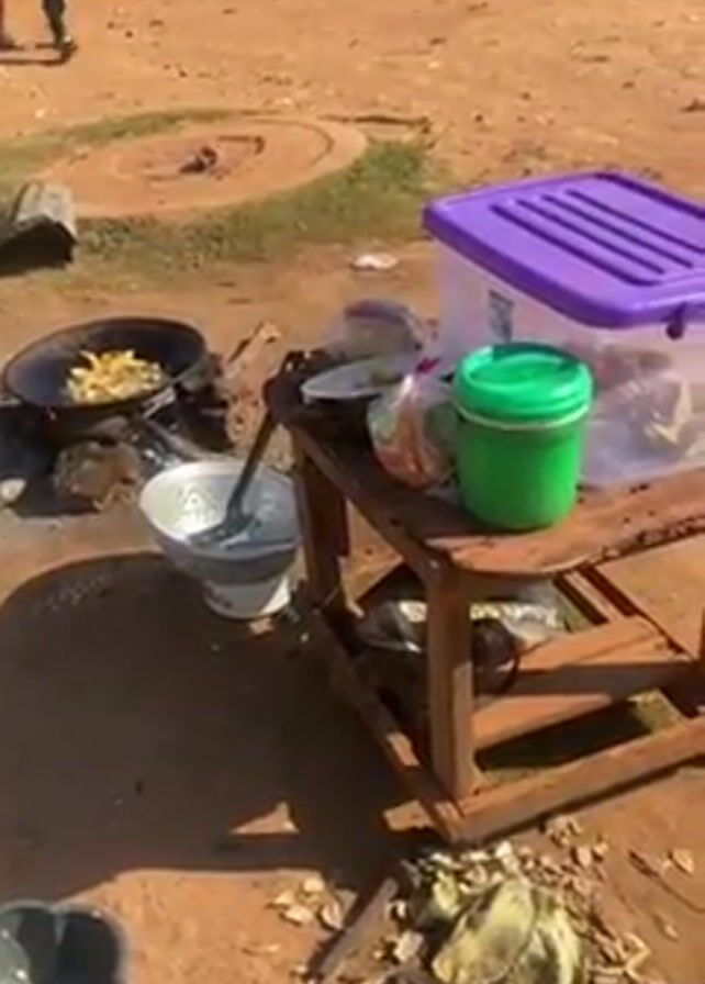 The camera pans across a food stall in an outdoor market. A large black pan sits on a small wood fire, frying what appears to be plantain chips. To the right, a small wooden table holds food supplies including pre-packed food, a green food container, and a purple storage bin. A metal colander rests beside the table. The ground is a mixture of bare earth and grass. People walk by in the background. The market area has overhead shelters and other stalls. The weather appears sunny.
