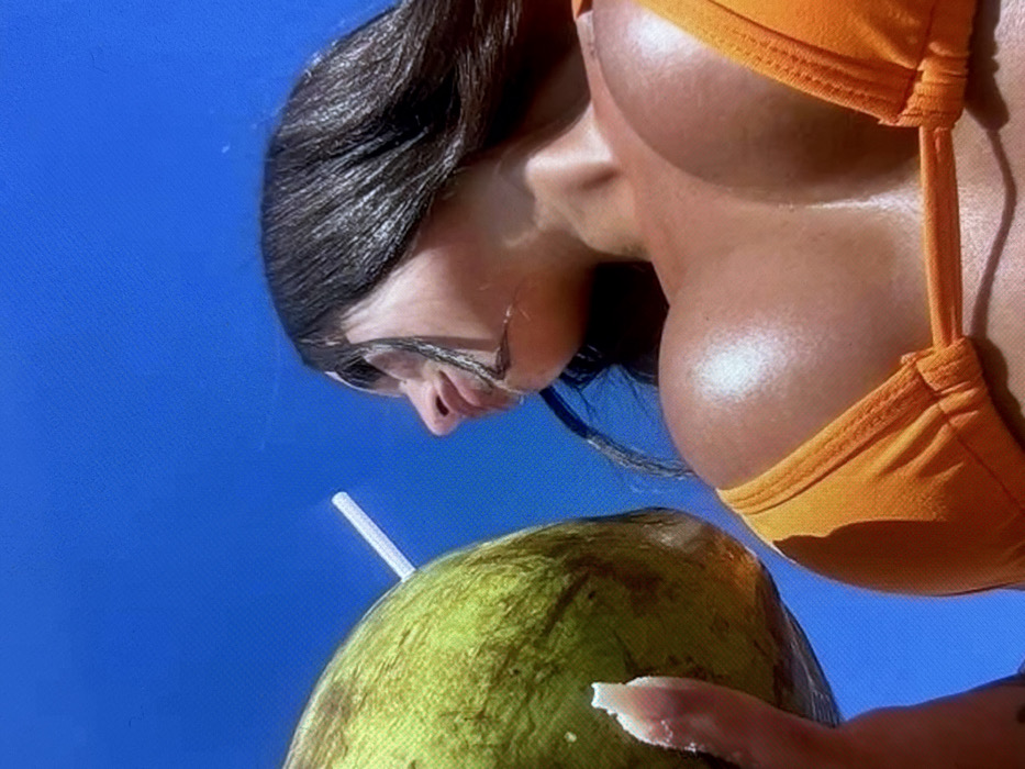A low-angle, close-up image captures a woman with long, dark, wet hair and tanned, glistening skin, wearing an orange bikini top