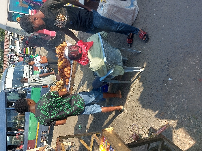 The image depicts an outdoor, sunlit street scene in what is identified as a busy public area within Dar es-Salaam, Tanzania, consistent with a bus terminal or market environment. The ground consists of worn asphalt with scattered debris and distinct shadows, indicating clear daytime conditions. In the foreground, three individuals are positioned around a makeshift street food stall. The stall features a flat surface laden with two distinct types of fried food: a mound of numerous light-brown, spherical items on the left, and a pile of larger, golden-brown, irregularly shaped fritters on the right. To the left, a young Black male, facing the stall with his back to the camera, wears a black t-shirt with green patterns, light blue denim shorts, and brown flip-flops. Seated directly behind the food stall, also with their back to the camera, is a person wearing an olive-green shirt and a red bandana or cloth covering the back of their head, occupying a light blue plastic chair. To the right of the stall, a young Black male, wearing a black t-shirt with a gold design and blue denim jeans, stands facing the food, with black and red striped slide sandals on his feet. A large white sack rests on the ground near his feet. In the mid-ground, a blue and green 'daladala' (minibus), characteristic of Tanzanian public transport, is prominently parked with passengers visible through its windows. To the right of the daladala, a Black male in a gray t-shirt is visible, and further right, a Black female in a white top and dark pants, carrying a brown shoulder bag, is present. The background shows additional vehicles, including another light-colored minibus and indistinct figures, reinforcing the scene's public and bustling nature.