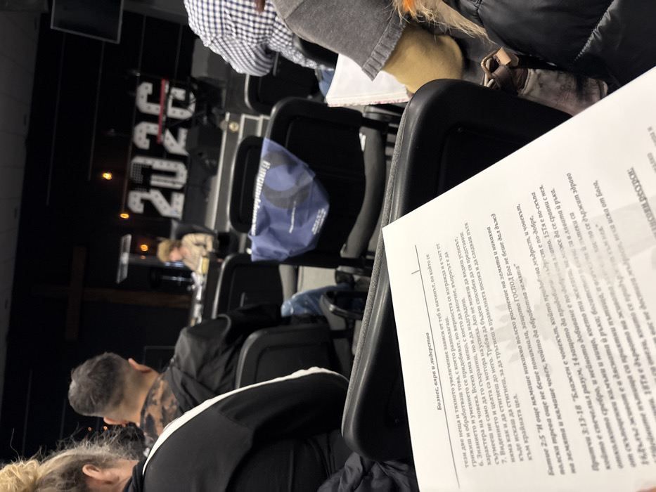 The image displays an interior scene from an event in Sofia, Bulgaria, viewed from the perspective of an audience member