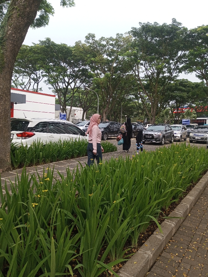A parking lot scene features parked cars and trees. A woman wearing a pink headscarf and jeans walks along a paved walkway with a strip of green plants on one side. Another woman in a black outfit is walking further down the pathway. There is a gas station visible at the end of the parking lot.
