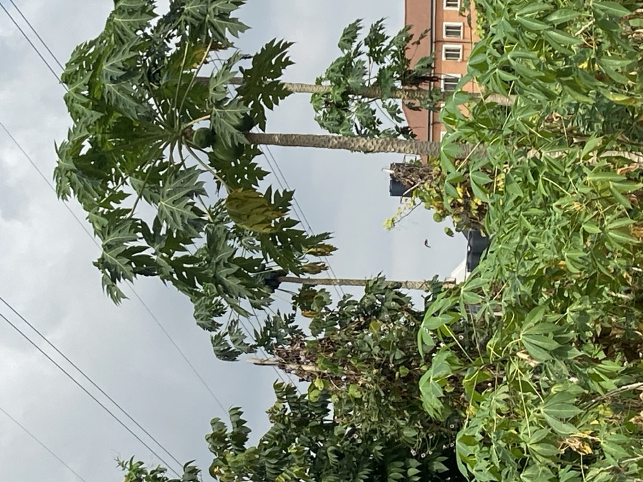 The image presents a vegetated scene in Oba, Nigeria, under an overcast sky. The foreground is occupied by a dense growth of large-leafed green plants, consistent with cassava. Several tall papaya trees rise from the mid-ground, with one prominent tree on the right bearing multiple green, unripe papayas clustered near its crown. Another papaya tree on the left displays some desiccated or discolored foliage. Above, multiple thin power lines extend diagonally across the upper portion of the frame against a uniform gray, cloudy sky. In the background, an orange-brown roofed residential building with light-colored walls and several rectangular windows is visible on the right. To the left of this building, dark cylindrical water tanks are discernible atop a distant structure. A small, dark, winged object is captured mid-flight in the central-right area of the image. No individuals are present, and no explicit actions or interactions are depicted.