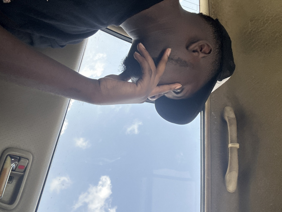 A dark-skinned individual, presumably male, is depicted seated inside a vehicle, angled to the right and gazing out a side window