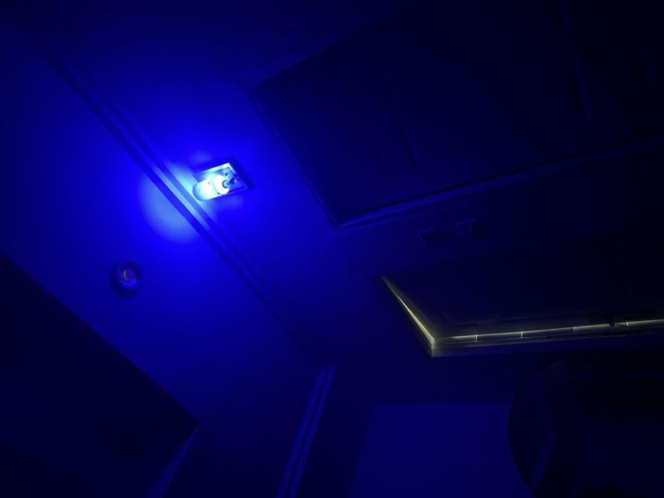 A blue-toned image reveals a room's ceiling, featuring a recessed light fixture with a visible bulb. To the left, a circular object, possibly a smoke detector, is affixed. A rectangular access panel and an air conditioning vent are also present. The room is bathed in an intense blue light, creating a stark contrast between illuminated areas and shadows.