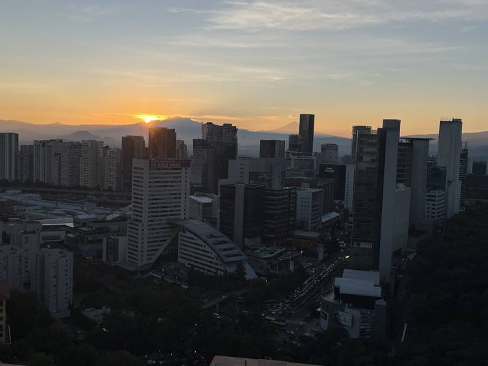 An aerial long shot captures the urban landscape of Santa Fe, Mexico City, during either sunrise or sunset
