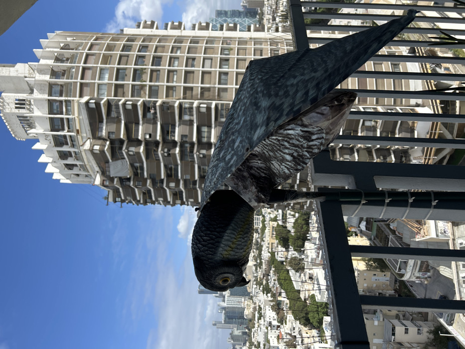 - "An artificial bird deterrent, resembling a dark grey and black hawk or falcon with a prominent yellow eye, is positioned on a metal balcony railing" by FM-Ws5Q53, licensed under CC BY 4.0