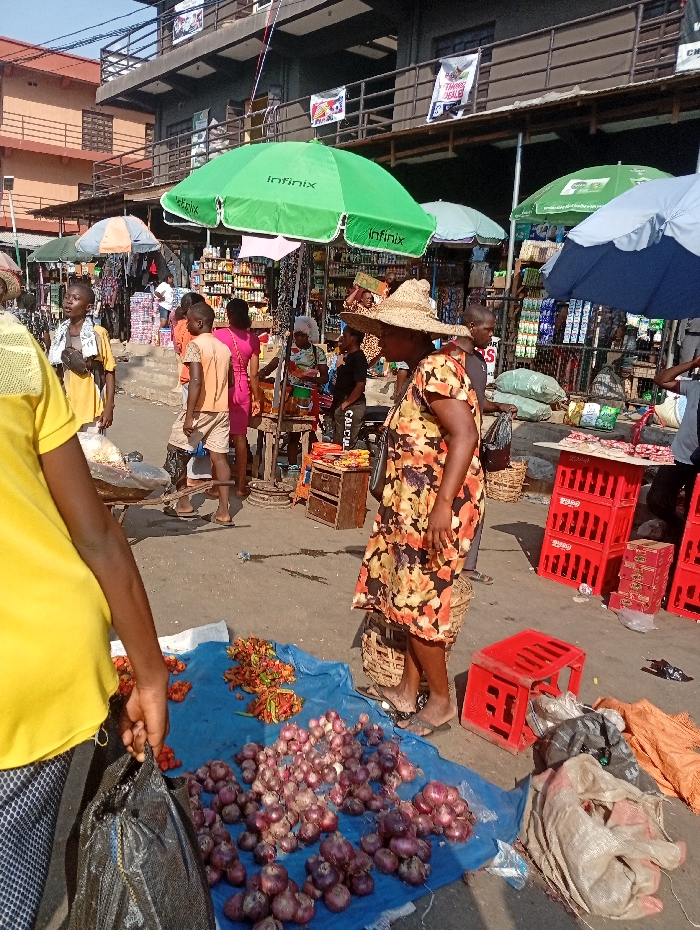 The image depicts a bustling outdoor market scene in Ogbunike, Nigeria, under clear daylight conditions