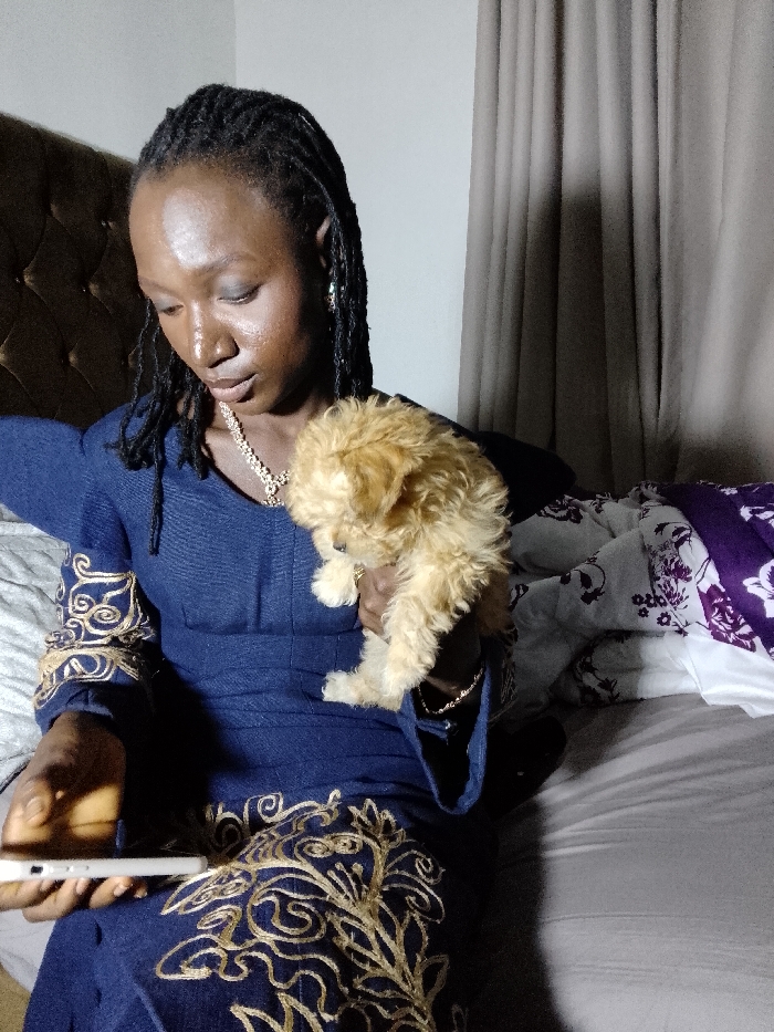 An individual with dark skin and braided hair is depicted indoors, seated on a bed in a residence located in Jos, Nigeria. The person wears a dark blue long-sleeved garment with prominent gold-colored embroidery and a sparkling necklace. A small, fluffy, light brown puppy is cradled in the person's left arm, facing towards the right. The right hand holds a white smartphone with its screen facing upwards. The individual's gaze is directed downwards. The background features a dark upholstered headboard to the left and light-colored drawn curtains to the right. A white and purple floral patterned blanket is visible on the bed to the right of the individual.