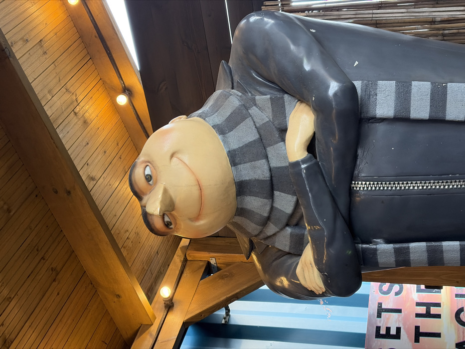 A life-sized statue of the animated character Gru, from the "Despicable Me" franchise, is prominently displayed within a covered structure in Felixstowe, United Kingdom