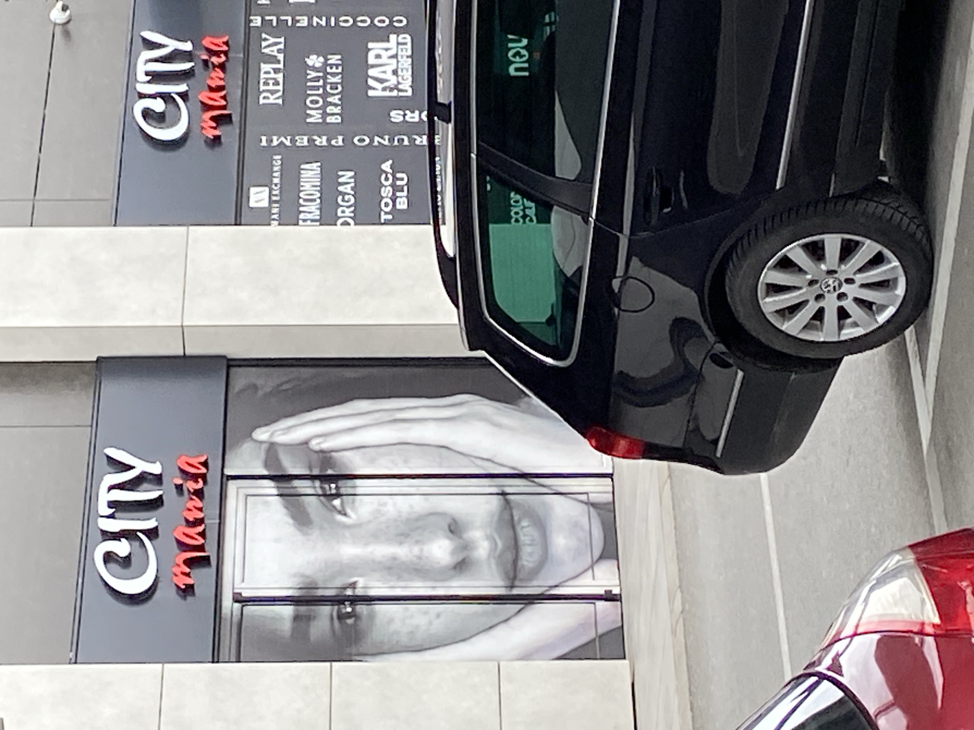 The image displays an outdoor scene in Dub, Montenegro, featuring a parking area in front of a modern commercial building. In the foreground, the rear left quarter of a red car is partially visible on the left, parked on light grey asphalt marked with a white line. To the right, a dark blue or black Volkswagen station wagon, identifiable by its wheel emblem, is parked, showing its rear and right side, including a roof rack and tinted windows. The background consists of a two-story building facade, likely a shopping center. Two storefronts are visible, both with overhead signs displaying "CITY" in prominent white 3D lettering and "Mania" in smaller red script. The left storefront features a large, black and white graphic covering the entrance, depicting a woman's face with freckles, her hands framing her cheeks. The entrance doors below this graphic appear to be glass. The right storefront's facade is dark, presenting a vertical list of various brand names in white text, including "ARMANI EXCHANGE," "FRACOMINA," "ORGAN," "TOSCA BLU," "REPLAY," "MOLLY BRACKEN," "KARL LAGERFELD," and "COCCINELLE." A white security camera is mounted on the upper right section of the building's exterior. The building's structural elements are light-colored, possibly concrete or composite panels. No individuals are present in the scene.