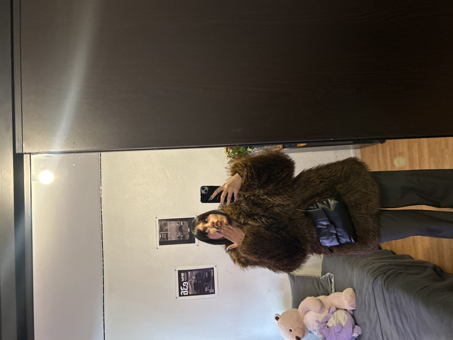 The image displays an indoor mirror selfie taken in a residential setting in Strasbourg, France. A female individual with dark hair and bangs is depicted, wearing a brown, shaggy faux fur coat, dark trousers, and a black quilted shoulder bag with a gold chain strap. She is holding a black smartphone in her left hand to capture the photograph. Her right hand is raised towards her mouth, which is puckered in a kiss gesture, and her eyes are directed upwards. The reflected background reveals a room with white walls and a light-colored wooden floor. A bare light bulb hangs from the ceiling. On the wall, two posters are visible: one on the left features a car and the text "AEG BMW," while another, darker image is to its right. To the left side of the reflection, a bed with dark grey bedding is present, adorned with a large light brown teddy bear and a smaller purple stuffed animal. A dark brown wardrobe or closet door is partially visible to the right of the mirror's frame.
