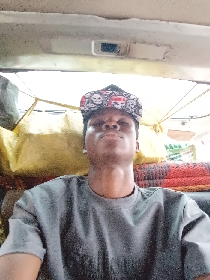 A young man with dark skin wears a grey t-shirt and a patterned cap. He is looking upwards with his eyes closed and a serene expression on his face. Behind him are large bags secured with rope, and a striped mat. The setting appears to be the interior of a vehicle, judging by the ceiling and overhead storage.