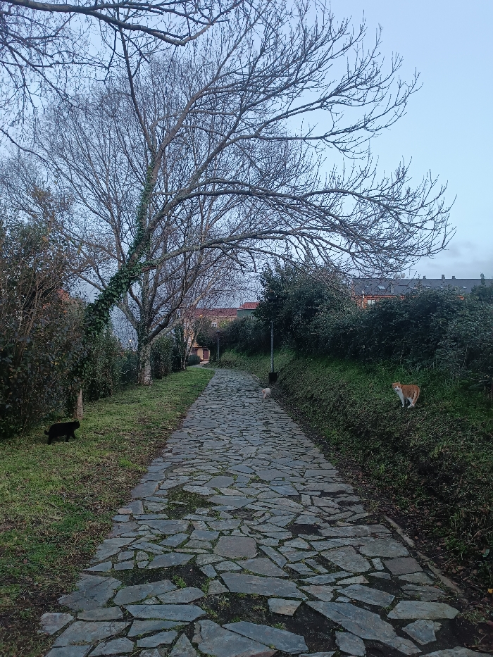 A stone path stretches into the distance, flanked by green vegetation and a large tree with bare branches. Three cats are visible: one black cat on the left, a pale cat on the path further down, and an orange and white cat on the right. Buildings can be seen in the background, suggesting a park or garden setting. The sky is overcast, lending a muted light to the scene.
