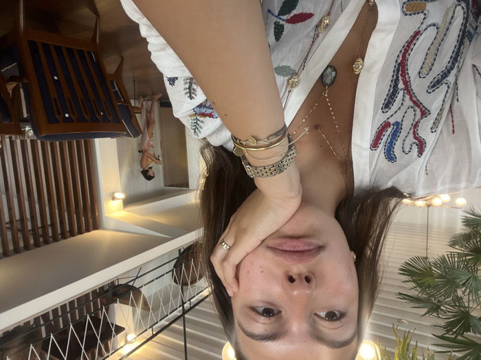 The image displays an indoor scene within a commercial establishment in Forte dei Marmi, Italy. In the foreground, a female subject with dark hair is seated, her right hand supporting her jawline, exhibiting a neutral expression. She wears a white, loose-fitting top adorned with intricate multicolored embroidery in blue, red, green, and black patterns. Multiple gold-toned necklaces, including one with a dark oval pendant and another with spherical ornaments, are visible around her neck. Her right wrist displays several bracelets, including a gold-toned metal link bracelet, a thin gold chain, and a woven cord bracelet, along with a ring on her right ring finger. The environment features a high ceiling with visible corrugated white panels and numerous exposed spherical light bulbs. Green palm-like foliage hangs from the ceiling in the upper left. A mezzanine level with a white railing featuring a crisscross design is visible in the upper background. To the right, a decorative slatted wooden wall panel is present, along with dark blue upholstered chairs with wooden frames, suggesting a dining or lounge area. In the mid-ground, further into the room, a second female subject is standing near a doorway, facing away from the viewer, appearing to be engaged with an object held in her hands. She is dressed in a light-colored, patterned full-length garment with a side slit.