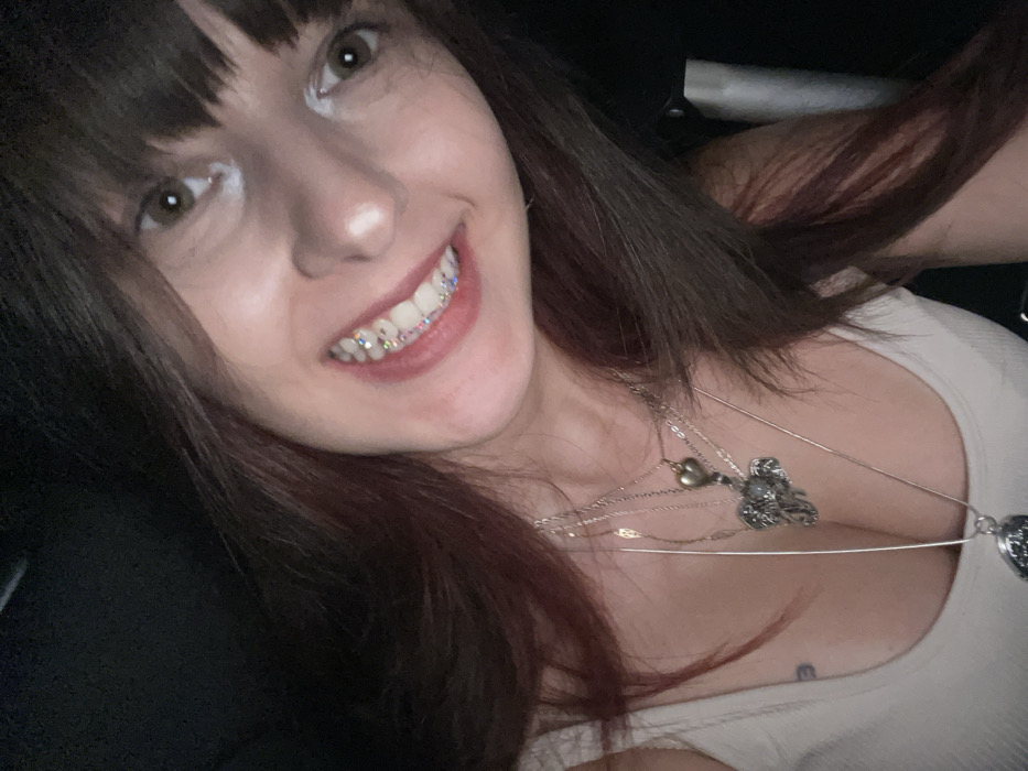 The image displays a close-up, chest-up portrait of a female individual. She has dark brown hair with reddish highlights and bangs, and her head is slightly tilted. Her brown eyes are visible, with white eyeliner applied to the lower lash lines. She is smiling broadly, revealing teeth fitted with dental braces that have multi-colored bands on the brackets, and several teeth exhibit small, reflective embedded adornments. She wears a light-colored, ribbed tank top. Multiple layered necklaces are visible: a longer silver-toned chain with an oval pendant, a chain featuring a dark, ornate elephant-head pendant with a central lighter stone, a chain with a small gold-toned heart pendant, and a thin chain with a small leaf-shaped charm. A small, dark tattoo is present on her upper left chest. The background is predominantly dark and out of focus, with a faint light-colored vertical object partially discernible on the far right. The subject is directly illuminated. No discernible features within the image allow for the identification of a specific location in Givat Hen, Israel.