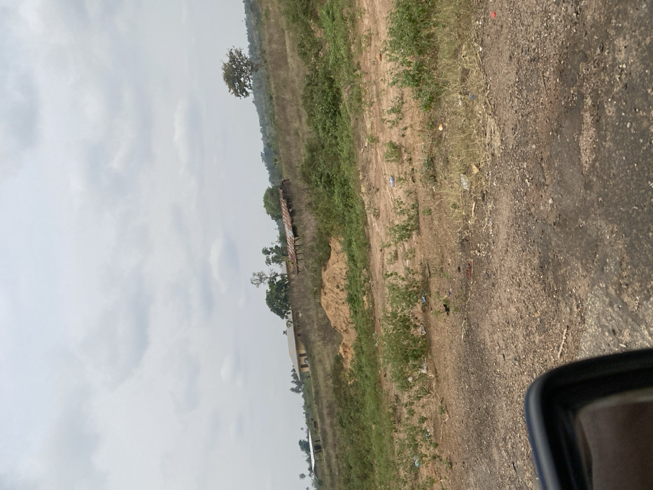 The image depicts a rural or semi-urban landscape in Owo, Nigeria, under an overcast sky with light grey clouds. The foreground consists of a dirt and gravel surface, likely a roadside or unpaved track, showing dark, worn patches and scattered debris, including plastic bottles and wrappers. A portion of a vehicle's black side mirror is visible in the bottom-left corner, suggesting the photograph was taken from within a vehicle. The midground features an ascending, uneven terrain covered with dry, sparse grasses and scattered low-lying green shrubs. A prominent pile of light-colored sand or earth is situated in the central left of this area. Litter is also present among the vegetation. In the background, positioned on the rising slope, are several structures and natural elements. To the left, a rectangular, light-colored building with a dark roof stands as a more permanent structure. Adjacent to it and further left are two open-sided structures with corrugated metal roofs on simple frames, potentially shelters or sheds. Towards the center, several trees, some with green canopies, punctuate the landscape. To the right, another structure with a heavily rusted or weathered corrugated metal roof is visible, appearing derelict. The landscape continues to rise into a distant hill, covered with vegetation and occasional trees. No individuals or discernible activities are observed.