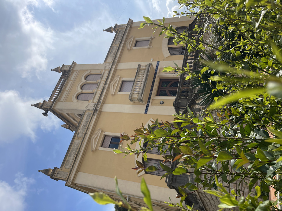 The image displays the "CENTRO MUSICAL SAN RAFAEL," a multi-story building located in Buñol, Spain, viewed from a low angle. The structure features a light yellow stucco facade with cream-colored trim and classical architectural elements. It consists of three visible stories, topped by a flat roof with a decorative stone balustrade and four pointed finials. A small, dark horn-shaped speaker is mounted on a finial on the top left side of the roofline. The central section of the top floor includes three arched windows with light-colored internal blinds. Below these, a small balcony with a stone balustrade projects from the second floor. Rectangular windows with dark frames and light-colored external shutters are present on the second and third stories. Above the main entrance, a blue rectangular sign with white capital letters reads "CENTRO MUSICAL SAN RAFAEL." The entrance features ornate dark wooden double doors with glass panels and is accessed via a wide stone staircase with a matching balustrade. The lower part of the building and the staircase base are constructed from rough-hewn, light-colored stone blocks. Dense, vibrant green foliage with some reddish-brown new growth occupies the immediate foreground, partially obscuring the lower sections of the building and staircase. A spiky, agave-like plant is visible to the right of the staircase. The background shows a bright blue sky with scattered white cumulus clouds. Strong sunlight illuminates the scene, creating distinct shadows and highlighting the building's facade and the foreground vegetation. No individuals or visible activities are depicted.