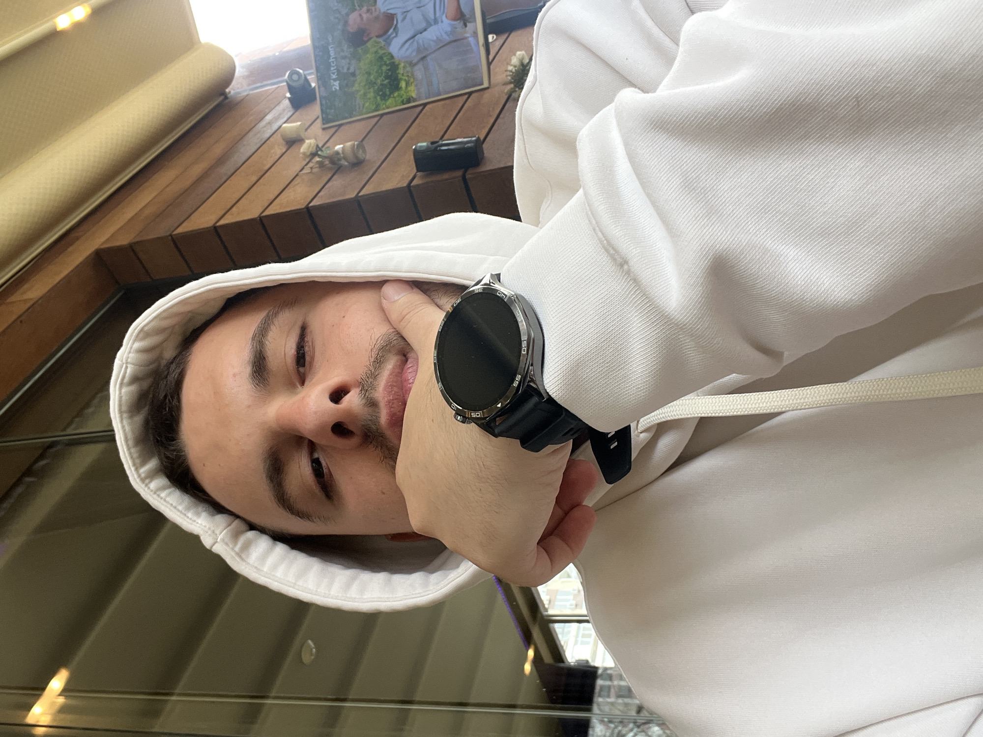 A selfie of a light-skinned male wearing a white hooded sweatshirt. The man has dark hair and a dark mustache and beard. He is wearing a smartwatch on his left wrist with a black band and black face. He is looking at the camera, his left hand touching his face. The background includes a wood-paneled wall, a picture frame, and a glimpse of a window with what appears to be a building outside. Although it is not possible to identify Burgas from the image, it is possible that the person is in Burgas, Bulgaria, if specified.