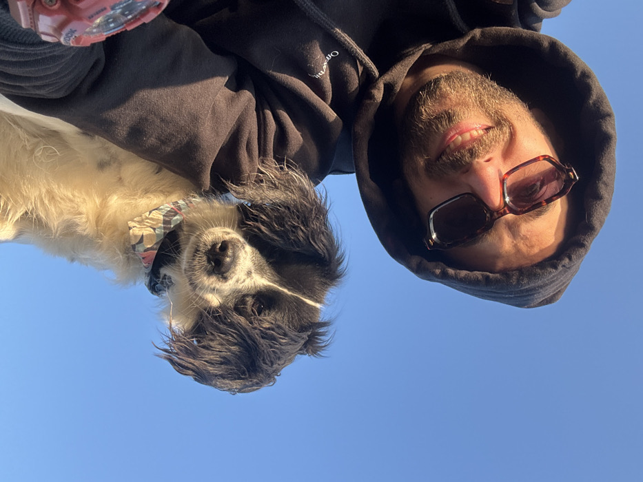 - "The scene depicts a male individual and a dog captured in a low-angle, close-up photograph against a clear blue sky, occurring in the city of Tsarevo, Bulgaria" by FM-LVnhY2, licensed under CC BY 4.0