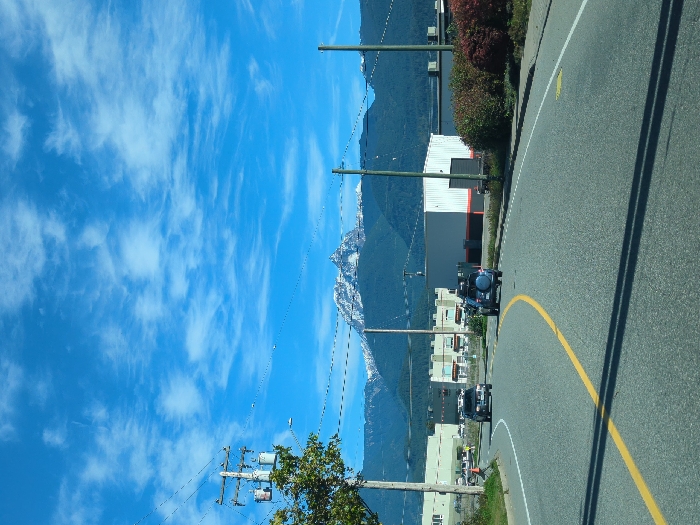 The image displays a daytime scene on a paved road with a mountainous backdrop, consistent with the geography of Area D (Elaho/Garibaldi), Canada