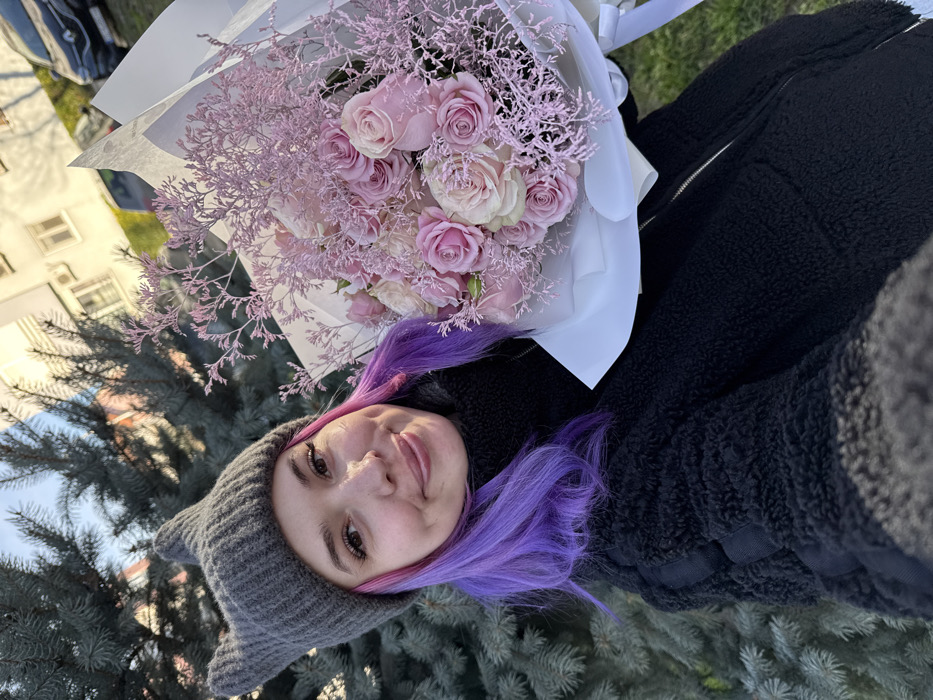 - "A young adult female with purple hair and a gray knit beanie with cat-ear protrusions is depicted from the chest up, holding a large bouquet of pink and light pink roses with pink filler foliage, wrapped in white paper" by FM-NjEox2, licensed under CC BY 4.0