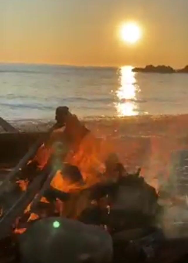 A campfire burns on a sandy beach with a rocky shore. The ocean is visible in the background, with the setting sun creating a bright reflection on the water. The fire is contained within a circle of rocks. The sky is a pale orange.