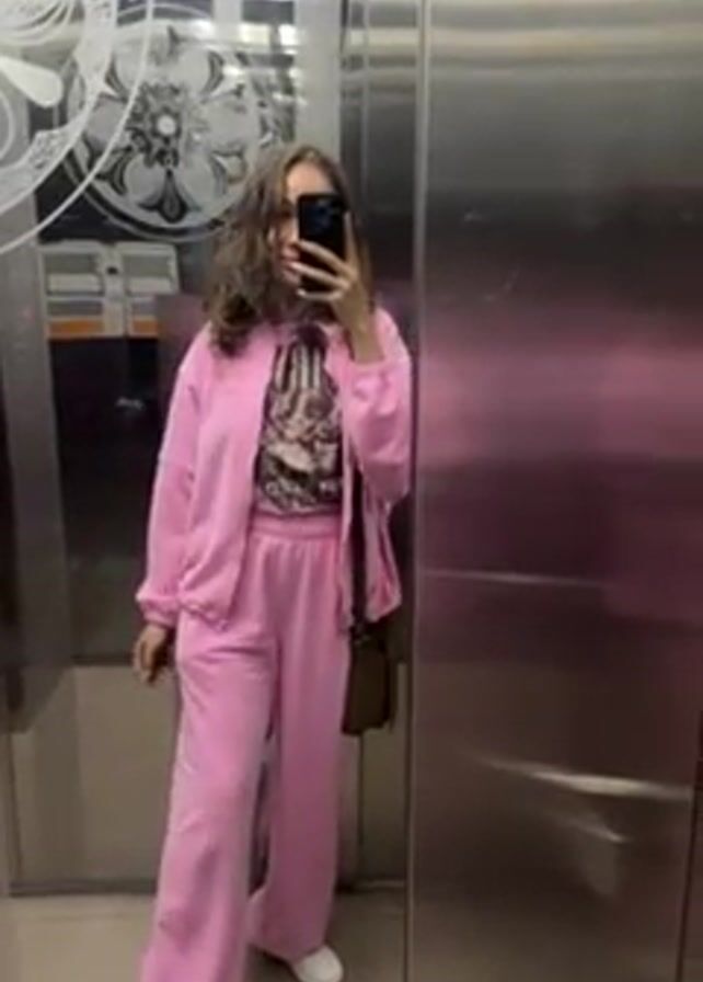 A young woman is in an elevator, taking a selfie in the mirror. She is wearing a pink tracksuit and white sneakers, and has a brown purse hanging over her shoulder. The elevator has mirrored panels and a silver door. The woman briefly adjusts her hair as she poses for the picture.