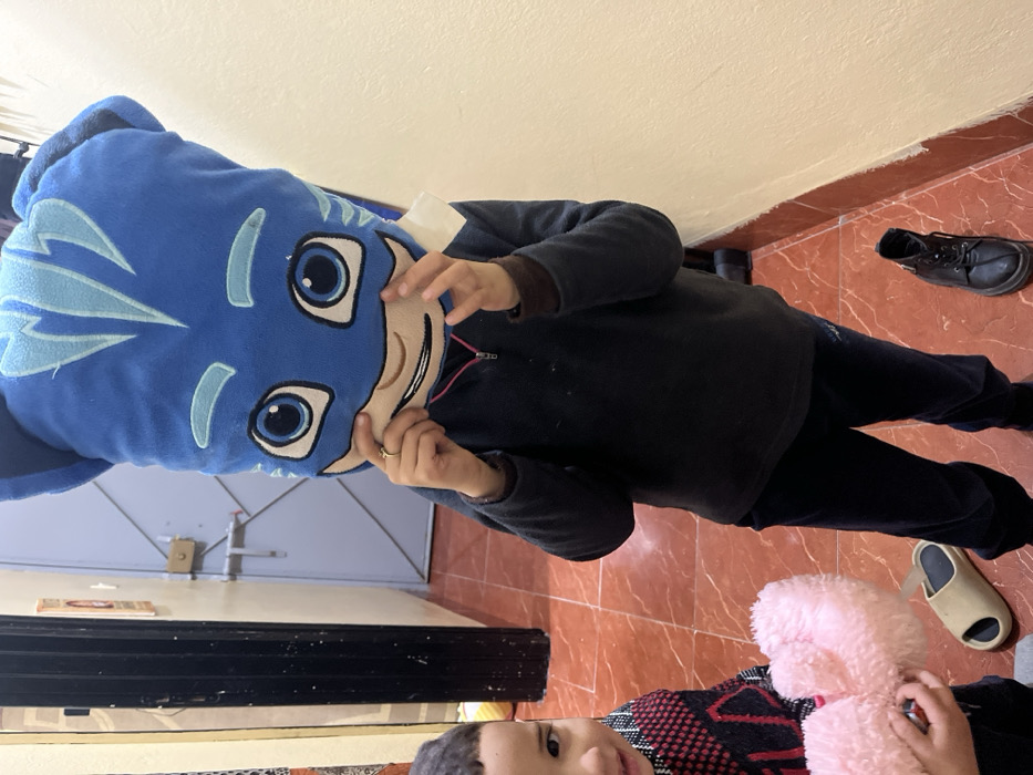A child stands indoors, holding a large blue Catboy plushie against their face. They wear a black jacket and pants. A younger child is partially visible at the bottom, holding a pink plush toy. The background shows a tiled floor, a closed door, and a pair of shoes. The lighting is bright.