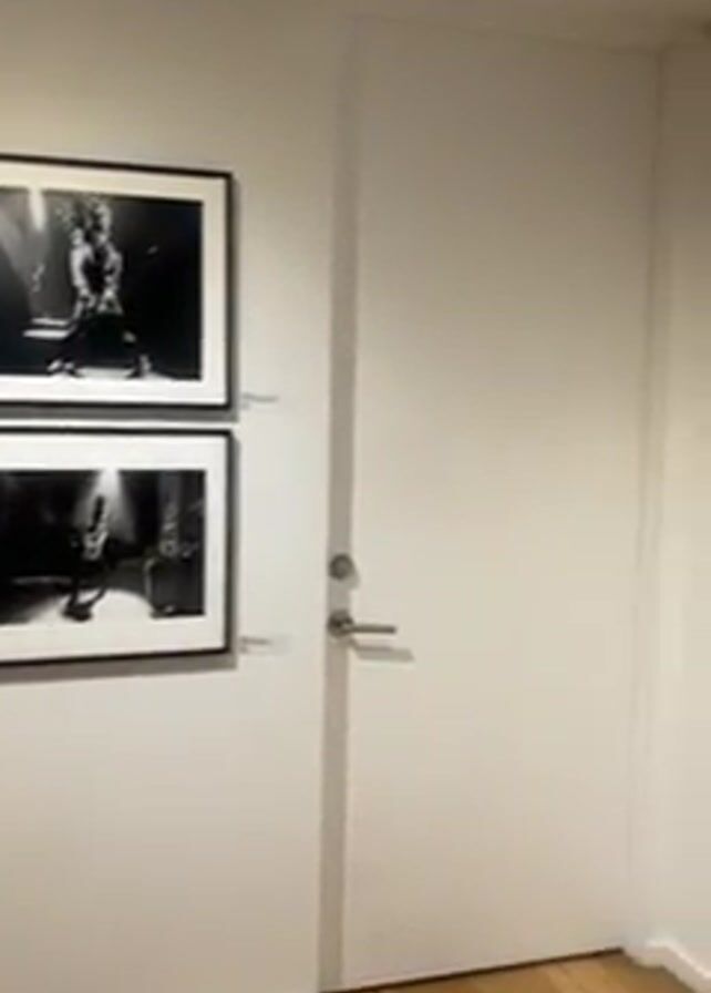 n art exhibit featuring black and white photographs by Dennys Ilic Hollywood Black and White. The camera pans from two framed photographs of a musician performing with a guitar on the left wall, to a white door, and then to the right wall where there are three framed portraits of men. The floor is made of light wood planks.