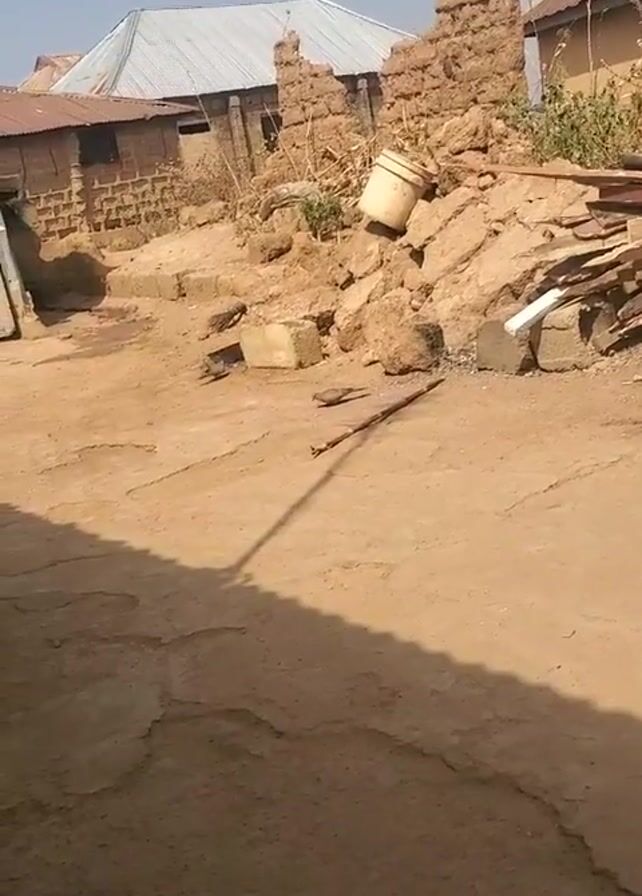 slightly elevated outdoor area with a sandy ground. There are buildings visible in the background, one with a metallic roof. A crumbling mud wall is present. A white bucket is visible on the pile of rubble. A stick lays on the ground and several birds are moving around. The bottom of the frame is shaded. A person wearing yellow clothing walks briefly behind the building with the brick wall.