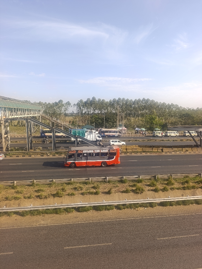 This image depicts an elevated view of a multi-lane highway in Gatongora ward, Kenya, under a clear blue sky with sparse white clouds. In the immediate foreground, a dark asphalt surface, possibly a lower road or shoulder, is visible. It is bordered by a light grey concrete barrier with a strip of dry, patchy grass and a metallic guardrail. The midground features a multi-lane highway, divided by a central median containing sparse vegetation and concrete barriers. Vehicles are present on the highway. A prominent red and grey "matatu" minibus, with "PRAISE THE LORD" written in white on its grey upper body, is moving from left to right in the near lane. Other vehicles, including white vans/minibuses, a light-colored sedan, and various trucks (one with a blue tarp), are visible on the highway, some moving and others appearing parked or stopped on the far right side. To the left and spanning across the highway is a pedestrian overpass structure, constructed from metallic grey supports and featuring a covered walkway with a green corrugated roof. It includes multiple ramps leading down to ground level. The background consists of a dense, linear stand of tall, slender trees, likely eucalyptus, stretching horizontally across the horizon. Beyond the trees, utility poles are discernible. No clearly identifiable individuals are visible within the frame.