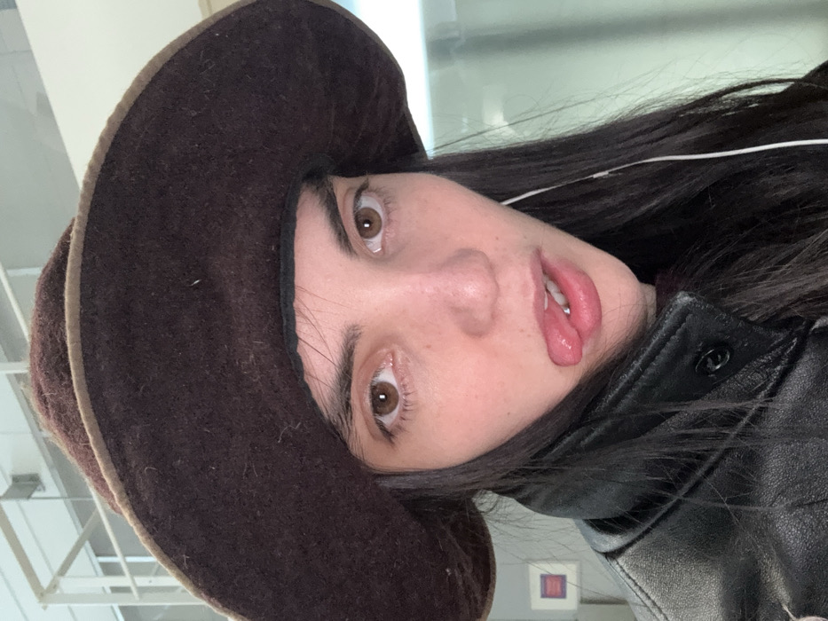 A person with dark hair and brown eyes wears a brown cowboy hat and a black leather jacket. The individual is looking at the camera, sticking their tongue out with a visible tongue piercing. They appear to be indoors, with a hint of a fluorescent light and window behind them. The image is slightly tilted.