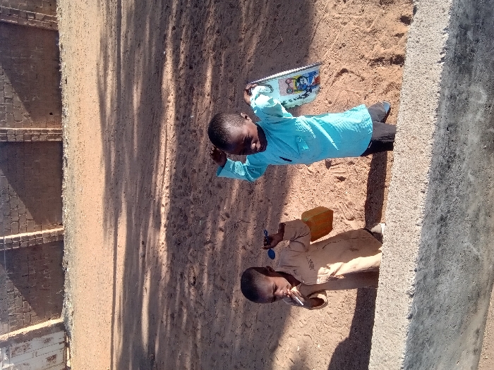 The scene is an outdoor environment in Wuro Dole, Nigeria, characterized by sandy, reddish-brown ground under direct sunlight. A low, rough concrete barrier occupies the lower foreground, partially obscuring the subjects. In the background, a light brown brick wall featuring vertical pilasters is visible, casting distinct shadows to the right. Two young boys are positioned behind the concrete barrier. The boy on the left, wearing a light tan long-sleeved garment, holds a white cylindrical object to his mouth with his right hand. His left hand simultaneously holds a blue spoon and a small, rectangular yellow container with a handle. The boy on the right, dressed in a light blue long-sleeved shirt and dark trousers, holds a white rectangular object identified as a book or tablet displaying colorful cartoon characters on its cover. This object is elevated with both hands, positioned above his head. Both boys appear to be looking forward, towards the viewer's perspective. Strong, distinct shadows are cast on the sandy ground, indicating direct overhead sunlight.
