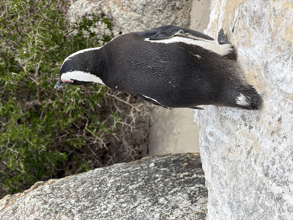 - "A single African Penguin (Spheniscus demersus) is observed from a rear-elevated perspective, standing atop a large, light-colored granite boulder" by FM-tYDL83, licensed under CC BY 4.0
